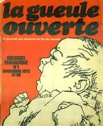 Quatre mois après la conférence de Stockholm, en novembre 1972, un nouveau venu fait son entrée sur la scène médiatique. Son titre comme sa couverture ne peuvent passer inaperçus. La Gueule ouverte se présente en effet comme « le journal qui annonce la fin du monde » et, pour associer l’image au mot, offre à ses lecteurs potentiels le dessin d’un profil de bébé hurlant. L’écologie politique trouve avec ce mensuel écologique sa voix médiatique. Après ce numéro un tonitruant, ou simultanément, d’autres titres vont surgir puis des chroniques spécialisées vont apparaître dans la presse généraliste.