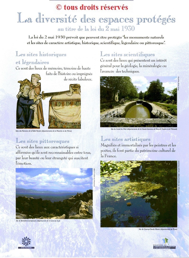 | 20060546/3 « La diversité des espaces protégées/au titre de la loi du 2 mai 1930/[...]/Les sites historiques/et légendaires/[...]/Les sites scientifiques/[...]/Les sites pittoresques/[...]/ Les sites artistiques/[...] », Parimage (Ed.), [1999], photos de Serge Sautereau, Jacques Chauvenet et la Photothèque des espaces protégés, [quatre photos représentant respectivement : les sites des Romans de la Table ronde dans la Manche et l’Orne, le Canal du Midi dans la Haute-Garonne, l’Aude et l’Hérault, le Belvédère en Corse du Sud, le site de Giverny-Claude Monet dans l’Eure, plus logo], 1 ex., 40 x 30 cm, couleur |