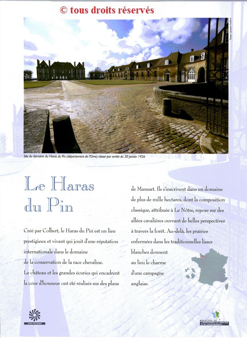 | 20060546/9 « Le Haras/du Pin/[...] », Parimage (Ed.), [1999], photo de Jacques Guillard, [vue de l’entrée du domaine du Haras du Pin dans l’Orne, plus logo], 1 ex., 40 x 30 cm, couleur. |