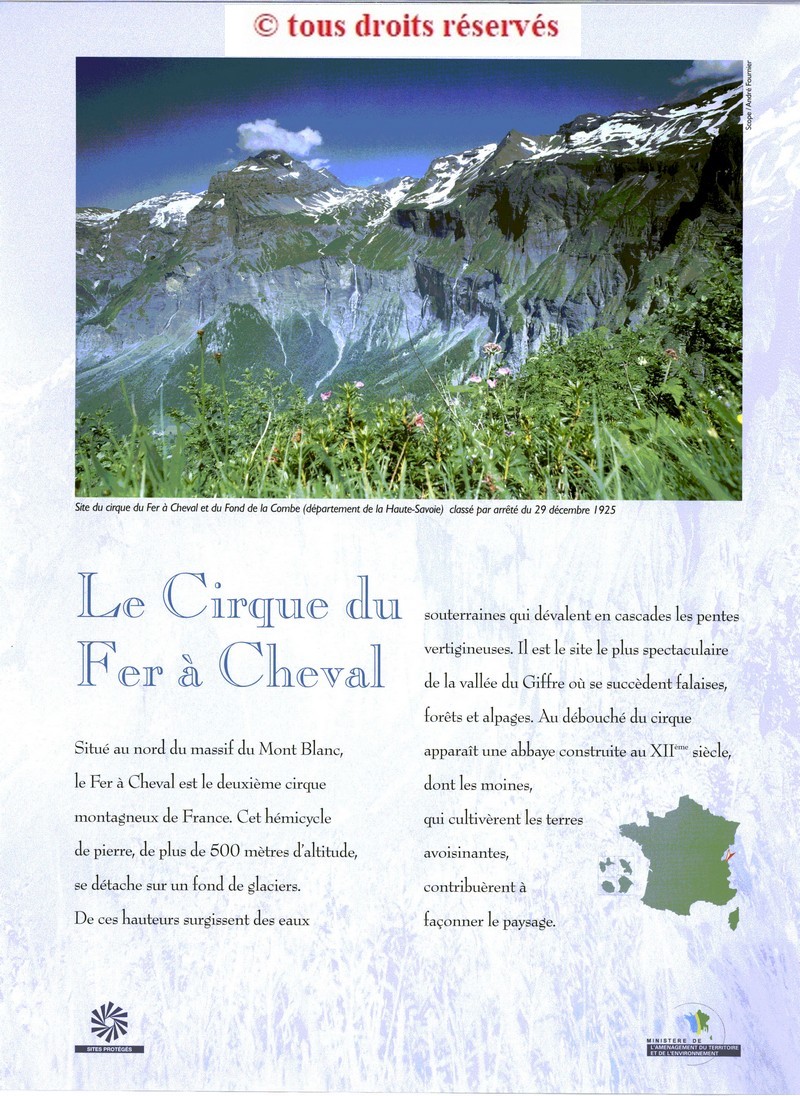 | 20060546/21 « Le Cirque du/Fer à Cheval/[...] », Parimage (Ed.), [1999], photo de André Fournier, [vue du cirque du Fer à Cheval et du Fond de la Combe en Haute-Savoie, plus logo], 1 ex., 40 x 30 cm, couleur. |
